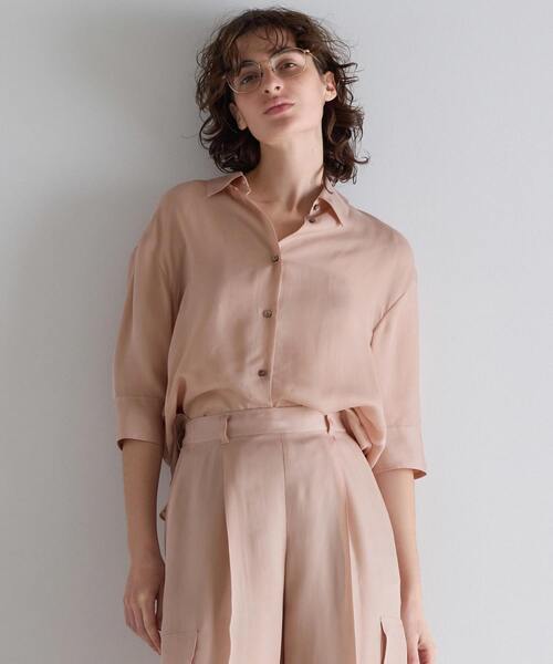 ≪デザインポイント≫ とろみと落ち感のある素材を使用した抜け感のあるオーバーサイズ半そでシャツです。絶妙な袖丈で春から秋まで使用可能です。後ろ中心のスリットもデザインポイントです。 ≪素材・着心地≫ キュプラ特有のシルクのような落ち感とふくらみがあり、フィブリル加工によるヴィンテージライクな表情感が特徴です。 ≪おすすめの着こなし≫ 同素材のパンツとセットアップで着用しても 透け感:なし 伸縮性:なし 光沢感:ややあり 裏地:なし 生地の厚さ:やや薄い ※お取り扱いについて 素材の特性上、雨や水に濡れると縮んで波打つことがありますのでご注意ください。部分的に濡れた場合は早めに拭き取り、アイロンで形を整えてください。色によっては輪ジミ(ウォータースポット)が発生することがあります。その場合は中性洗剤を使用し、裏返してネットに入れ、短時間で優しく押し洗いしてください。シワになりやすいため脱水機は使用せず、タオルで両面の水分を取り、形を整えて干してください。