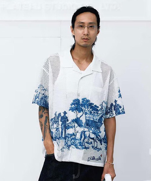 ※メーカー品番:PLA26SST05ー Design ー・透け感のある繊細なレース素材を全面に使用した、清涼感溢れるサマーシャツ。・ブランドのアイコンである馬のデザインを大胆にプリントし、クラシックさとモダンさを融合。・ややゆったりとした身幅に対し、着丈を短めに設定した今季らしいボックスシルエット。・インナーとのレイヤードにより表情が変化し、スタイリングに奥行きを与える仕様。ー Fabric ー・通気性に優れ、真夏でもストレスフリーに着用できる軽量なレース生地を採用。・レース特有の透け感が、ストリートなグラフィックに程よい抜け感と色気をプラス。・柔らかな肌当たりながら、シルエットを美しく保つ適度なハリ感を備えた上質な仕上がり。【PLATEAU STUDIO / プラトースタジオ】2019年よりスタートした台湾発のストリートブランド。台湾では知らない人はいないほど影響力のあるNo1ブランド。デザイナーのJerryは日本のストリートカルチャーに影響を受け、自身のホームタウンである台湾のカルチャーとミックスした独自のクリエーションを行う。※取り扱いについては、商品についている品質表示にてご確認下さい。※照明の関係により、実際よりも色味が違って見える場合があります。またパソコン・スマートフォンなどの環境により、若干製品と画像のカラーが異なる場合もございます。※商品の色味は、商品アップ画像をご参照ください。本体:洗濯機洗い(弱)