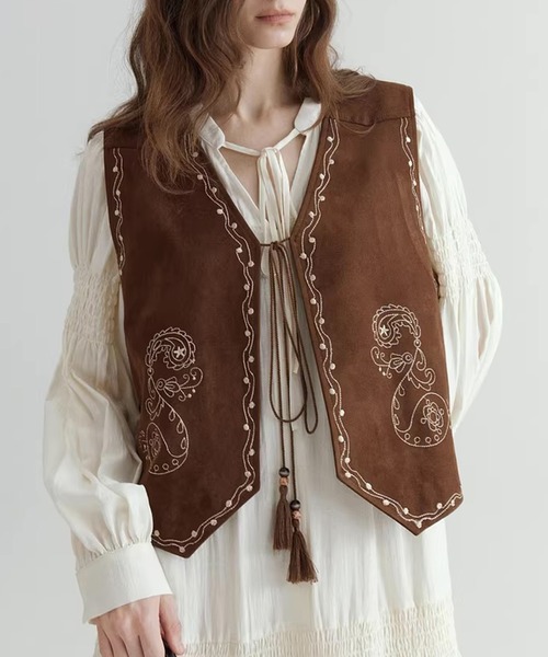 "国内でchucllaだけが、正規取扱いするコンテンポラリーブランド" ヴィンテージライクなムード漂う、フェイクスウェード素材のVネックベスト。 表情のある刺繍デザインが、装いに奥行きを添えます。 タッセル付きのフロントリボンが、軽やかなアクセントに。 さりげなく個性が光るディテールが、スタイリングのポイント。 ワンピースに重ねれば抜け感のあるレイヤードに。 デニムと合わせれば、こなれたカジュアルスタイルが完成します。 装いの主役になる、印象的な一着です。 【Fano Studios】 レトロ・シック・フレンチカジュアルをテーマに トレンドを取り入れながらも女性らしさを兼ね備え、 洗練されたデザインを発信するブランド。 取扱注意事項 ※サイズは、測定方法と測定者によって多少の誤差がありますのでご了承下さいませ。 また体型によって、サイズ感に個人差がございます。(平置き採寸) ※商品によってはシワがつきやすく、畳みジワや折りジワなどが強く出る場合がございます。 その際は加湿した風呂場に数時間干すか、スチームアイロンでのお手入れをお勧めしております。 ※生地の素材上、においが気になる場合がございます。 その際は陰干しして頂くと、ほとんど感じにくくなります。 ※レース等の繊細な素材を使用している場合には、お取り扱いにご注意下さい。 ※デニムを使用した製品は、インディゴ染めをしています。汗や摩擦により移染しやすいので、白色、淡色の組み合わせや重ね着はお避け下さい。 ※ニット素材を使用した製品は、重みで伸びやすくなりますのでハンガーでの保管はお控えください。 ※お洗濯の際には、品質表示の指示に従ってください。必要であれば専門店にご相談ください。 家庭でご洗濯できる商品に関しては、洗濯専用ネットをご使用の上、個別での洗濯をお勧めいたします。 お色物は、色移りする可能性がございます。 ※着用画像は撮影状況や光によって、多少異なる場合がございますので、置き画像をご確認下さい。 ※ カーディガンを含むニットやセータ類は、各箇所の縫い目にほつれているような糸が見えることもございます。 仕上げの特徴上、縫留めの箇所となりますためくれぐれも引っ張らないようお願い申し上げます。 引っ張ることにより縫い留めがほぐれる恐れがございます。 ※2023年7月1日より、環境に配慮した取り組みの一環として、紙のアテンションタグを廃止しております。