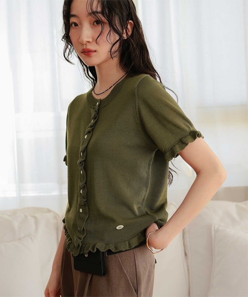 フリルデザインが女性らしさを引き立てる、半袖ニットカーディガン。■Point・フリルデザイン:袖口と裾にあしらったフリルで華やかさと女性らしさをプラス。・コンパクトシルエット:クルーネックと程よい丈感でスッキリ着こなせる。・多用途:前を閉じてトップスとして、前を開けて羽織りとしても着用可能。・さりげないアクセント:左裾のチャームが上品なポイントに。■Coordinate・カジュアルコーデ:デニムやチノパンと合わせて大人カジュアルに。・きれいめスタイル:スカートやスラックスと合わせて上品なコーディネートに。・レイヤード:ワンピースやシャツの上に羽織れば、フリルがアクセントになり華やかさをプラス。・春夏に最適:軽やかな半袖で、シーズン通して活躍する一枚。クルーネックとコンパクトな丈感でバランスの良いシルエットを演出し、1枚でも羽織としても活躍する万能アイテムです。※当商品は機械による生産の過程上、どうしても"生地を織る際の糸の継ぎ目"や多少の"ほつれ"、他繊維の"混紡"、また、形やサイズや柄に多少の"誤差"が生じる場合がございます。※サイズは、実寸サイズを測っているため多少誤差がでる場合があります。製造工程の関係上、各採寸箇所実寸(平置き)より【約-3cm~+3cm】程度は誤差の許容範囲とさせて頂いておりますので、予めご了承くださいませ。※メーカーより密封状態で入庫し、検品時に再度袋詰めを行っておりますが、素材により染料等の臭いが強い場合がございます。※発送上の状態によって商品がシワになる場合がございます。※商品により色落ち・色移りがある場合がございますので、品質表示をご確認の上、お取り扱いにご注意くださいませ。【伸縮性】あり【透け感】淡色のみ多少あり