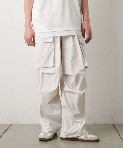 【立体感のあるストレッチカーゴパンツ】柔らかく伸縮性のある素材を使用したカーゴパンツです。サイドにはフラップポケットが配置されており、小物を簡単に収納できるだけでなくコーデのアクセントにもなります。膝部分にタックを施すことで、動きやすさを持たせつつ立体感のあるリラックスしたシルエットになっております。タフな印象を与えつつも、ストレッチ素材でフィット感と快適さを兼ね備えたアイテムで、裾にはドローコードがついているので、裾のフィット感を自分好みに変えることができスタイルに変化をつけることができます。また、裾部分を絞ることで足元が引き締まりシルエットにメリハリを持たせることができます。ウエストは紐とゴムで楽な穿き心地になっております。【商品ポイント】・ストレッチ素材でフィット感と快適さを兼ね備えたアイテム・立体感のあるリラックスしたシルエット・裾にはドローコード付き----------------------------------------------------■商品特徴洗 濯 方 法 :洗濯機洗い可(弱)裏 地 :なし透 け 感 :なし伸 縮 性 :ややあり光 沢 感 :なし生地の厚さ:普通----------------------------------------------------■素材 ポリエステル 100%----------------------------------------------------※着用、お取り扱いの際は、商品についている品質表示とアテンションタグを必ずご確認下さい。※商品タグに記載されている商品名がWEBでの表記名と異なる場合があります。※実際の商品と仕様、加工、サイズが若干異なる場合がございます。※照明の関係により、実際よりもやや明るく見える場合がございます。またパソコンなどの環境により、若干製品と画像のカラーが異なる場合もございます。予めご了承くださいませ。【お気に入り登録】してお得な情報をCHECK!!・「商品のお気に入り登録」で再入荷通知や、ラストの通知、セール通知も受け取ることができます。・「ブランドのお気に入り登録」で新商品や再入荷など、お得な情報を受け取ることができます。