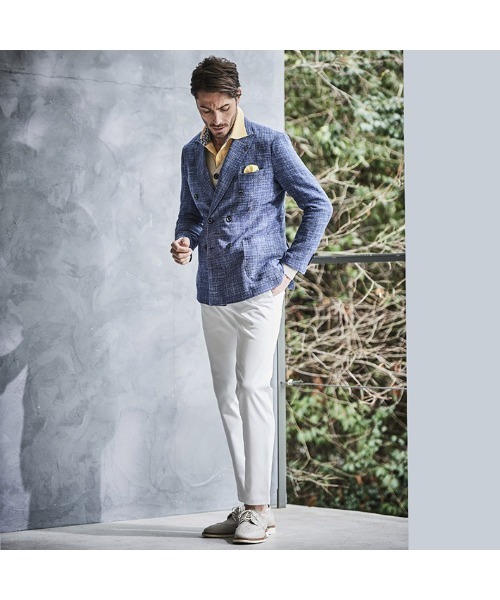 イタリアの老舗ウールメーカー「Tollegnoトレーニョ」の「3D WOOL」を使用したダブルジャケット。 ウール+リネン+コットンのざっくりとした表情ながらも、上質感ある素材感が魅力のイタリアンファブリック。 トラッドで力強い印象のダブルブレストに、多色の糸使いで杢調に仕上げられた美しいブルーが季節感ある面持ちをプラスし、 大人にふさわしいサマージャケットに仕上げました。 ピュアビギンウールというラグジュアリーなクオリティに、ナチュラルストレッチ性をプラスした心地良い着用感も魅力です。 デザインは背抜き&裏地なしのライトな着用感を重視した仕立てと、カジュアルなパッチポケットで軽快な印象に仕上げました。