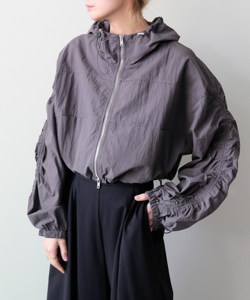 立体的な袖デザインが魅力の、ラフに使えるフードブルゾン 【Material】 軽くてドライな風合いのコットン生地を使用。 柔らかなハリ感が、立体的なシルエットを自然に作ってくれます。 【Design】 フード付きのショートブルゾンに、袖全体へ施したシャーリングがアクセント。 ボリュームが出るので、羽織るだけで動きのある表情が生まれます。 裾はドロスト仕様なので、シルエットを変えて着用していただけます。 【Size】 ゆるめのシルエットで、リラックス感のある着心地。 ショート丈のバランスがボトムとの組み合わせを選ばず、デイリーに使いやすい1枚です。 【Styling Point】 デニムやカーゴなどカジュアルなボトムと合わせてラフに。 スカートやワンピースなどきれいめアイテムとのMIXコーデもおすすめ。 ワードローブに1枚あると重宝するショートアウターです。 【商品特性】 透け感:なし 裏地:なし 伸縮性:なし 光沢感:なし 生地の厚さ:普通 ▼お気に入り登録 アイテムをお気に入り登録・・・再入荷やラスト1点、セールなどの情報をお知らせします! ブランドをお気に入り登録・・・新作や販売開始のお知らせを受け取れます! ※撮影時の光の加減やご使用の端末により、実際の色味と異なる場合がございます。あらかじめご了承くださいませ。