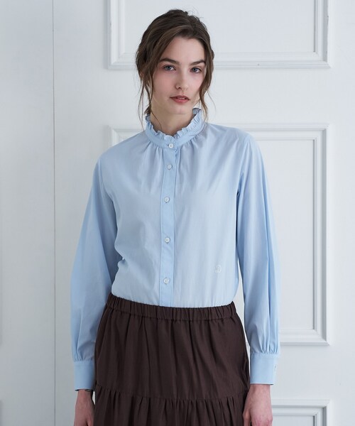 【衿元のフリルが華やかなスタンドフリルシャツ】 ●衿元にあしらわれたフリルで顔まわりが華やかに ●リラックス感のあるシルエットで今っぽく着られる ●1枚でも存在感のあるデザインですが、ニットやアウターとのレイヤードで長く活躍する ●こだわり スタンドカラーの衿端にフリルをあしらったシャツ。 少しリラックスしたサイズ感のシルエットで、堅苦しくならずに今っぽい雰囲気に仕上がります。 春から秋口には一枚で、冬にはニットやスウェット、アウターとレイヤードしていただくと、スタイリングの幅が広がりワードローブに一枚あるだけで便利なアイテムです。 ●素材 毛羽の少ない細番手のきめ細やかなブロードを使用。 張り感、シャリ感のある素材でフリルも甘すぎず、すっきりとした印象に仕上げています。 ※照明の関係により、実際よりも色味が違って見える場合があります。また、パソコン・スマートフォンなどの環境により、若干製品と画像のカラーが異なる場合もございます。 店舗へのお問い合わせ商品番号:085-85051 ●製品寸法: 34(SS):着丈60cm B94cm 袖丈58cm 肩幅38cm 36(S):着丈61cm B97cm 袖丈59cm 肩幅39cm 38(M):着丈63cm B100cm 袖丈60cm 肩幅40cm 備考: