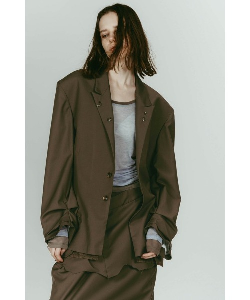サイズ(平置き)|着丈|バスト幅|肩幅|袖丈|袖ぐり|袖口幅|内(衿)天幅|裾幅|, FREE|75cm|50cm|50cm|59cm|24cm|19.5cm|16cm|57.5cm| ※Knuth Marf基準の測定方法になります。 (gray, brown)素材:ポリエステル80%/レーヨン20% 裏地(共通):ポリエステル100% (leatherblack)素材:合成皮革 裏地(共通):ポリエステル100% 透け感:なし 伸縮性:なし 重さ:0.49kg --- 「ハンサムなだけじゃない」 構築的なフォルムに、 ボディピアスのディテールを添えたジャケット。 ”身体を主張しないハンサムシェイプ” Knuth Marfになかった新しいシルエット。 ローライズに緩やかに入る シェイプラインはハンサムなくびれに。 コンサバになりがちなシェイプをモードに変える。 後ろは傾斜を上げて立体感ある流れに。 裏地とのレイヤーが生きて ラフさと緊張感のあいだに立つバランス。 袖はボリュームを持たせタックでルーズさを、 全体の相反する組み合わせが面白さを生む。 ※blackのみレザー素材です。 ※cut layered mid length skirtとセットアップで着用可能です。" --- 品番:KM26SPG01