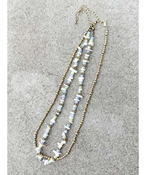 抜け感のある色味をベースに、複数のカラーをランダムに配置したビーズネックレスとボールチェーンのセット ■デザイン 2連でレイヤードしても、それぞれ単品でも使えるデザインで、夏らしさと大人っぽさを兼ね備えています。 天然のシェルを混ぜ込み、ガラスビーズとシルバーメッキの真鍮パーツを使用。 異素材の組み合わせが程よい存在感を演出し、軽やかな印象です。 ■サイズ感 首元に程よく沿うバランスの取りやすいサイズ感。重ね付けしてもすっきりと着用できます。 ■スタイリング Tシャツなどのカジュアルなスタイリングに合わせても大人な印象に仕上がり、夏のコーディネートのアクセントとしておすすめです。 ※商品画像はサンプルのため、色味やサイズ、素材の混率等の仕様に 変更がある場合がございます。予めご了承ください。 ※生地寄り画像を正規の商品の色味に近づけております。 ■商品のお気に入り登録 再入荷通知やラスト1点、お得なプライスダウンの情報も受け取ることができます。 ぜひご登録ください◎