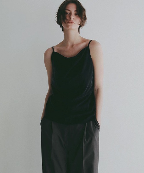 ー2026 SUMMER PRE ORDERー2/27(FRI)12:00-3/1(SUN)23:59※こちらの商品は受注期間限定で10%OFFの特別価格にてご注文いただけます。この機会をぜひご利用ください。上品な光沢と繊細なドレープが視線を惹きつける、キュプラジャージ素材のキャミソールドレープデザインのキャミソールを、今季はキュプラ混のカットソー素材でアップデート。キュプラとポリエステルのブレンド生地はヴィンテージ感のある風合いと上品な光沢感を併せ持ち、 キュプラ特有のほのかなきしみとシルクのような滑らかな肌触りと生地のしなやかさが際立つ仕上がりに。さらに製品加工を施すことで、より柔らかく肌に馴染む質感を実現し、軽やかで快適な着心地を叶えています。フロントには美しいドレープを描き、デコルテラインを女性らしく引き立てるデザインに。バックスタイルは真っ直ぐなラインに仕上げることで、女性らしさをより強め、洗練された印象を演出します。華奢なストラップとすっきりとしたシルエットが抜け感をもたらし、モードな印象をプラス。同素材のキュプラジャージロングスカートとのスタイリングでキャミドレスのような着こなしが完成し、セットアップならではの統一感あるスタイリングが楽しめます。デイリーからちょっとしたお出かけまで、スタイリング次第で表情を変える、大人のワードローブに寄り添う一枚です。ーーーーーーーーーーーーーーーーーーー【洗濯表示】液温は40℃を限度とし、手洗いによる洗濯処理が可能です漂白処理はできませんタンブル乾燥は出来ません日陰のつり干しがよい底面温度120℃を限度とし、アイロン仕上げができます石油系溶剤又はデカメチルシクロペンタシロキサンによる弱いドライクリーニング処理ができます非常に弱い操作のウエットクリーニングができますーーーーーーーーーーーーーーーーーーー▼商品のお気に入り登録お気に入りアイテムの再入荷や残り1点の通知を受け取ることが出来ます▼ブランドのお気に入り登録新作アイテムの入荷や人気アイテムの再入荷、タイムセールやクーポンなど、いち早くブランドのお得な情報を受け取ることができますーーーーーーーーーーーーーーーーーーー※予約商品の画像はサンプルで撮影しております。実際の製品とは仕様や素材、サイズや色味等が若干異なる場合がございますので予めご了承ください。※生産の都合上、発送予定時期が前後する場合がございますので予めご了承ください。※原産国・組成については暫定のものになります。※外での撮影画像、お客様のお使いのモニター設定などにより、色味が違って見える場合があります。 商品の色味は、スタジオ撮影の画像をご参照ください。