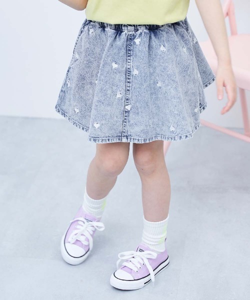 小さなハートをたくさん詰め込んだデニムスカッツ。夏でもはきやすい薄手のデニム生地で仕上げました。■シリーズかわいさに”キュン”としたり、動きやすさに”ワクワク”したり。「それ似合ってるね」ってほめられるともっと、もっと好きになる今日も、明日も思わずえらんで、はきたくなるdevirockのデニムOh! My Denim“お気に入り”を見つけてみない?■素材・スカート:柔らかな肌ざわりをしたデニム素材 季節問わず着やすい柔らかな風合いが魅力。 程よい厚みで軽い着心地も特徴です。・インナーパンツ:薄手のブロード素材 さらっとした肌ざわりが心地良い素材。 薄手なので汗ばむ日でも快適に過ごせます。伸縮性:スカート・なし/インナーパンツ・なし■スタイリングトップスをINした着こなしがおすすめ。お気に入りのTシャツを合わせた、程よくかわいいカジュアルコーデに仕上げてみてください。■アピールワードミニスカート 膝上 インナーパンツ付き デニムスカート スカート ボトムス■洗濯方法洗濯機洗い可(デリケート洗い) / 漂白剤使用不可 / 乾燥機使用不可 / 日陰つり干し/ 洗濯ネット使用■ご注意事項・製造過程上、糸の端が残ることがございますが、商品に問題はございません。気になる方は切ってご着用ください。・素材の特性上、摩擦や水濡れお洗濯などで、色落ち・色移りしますので、ご使用の際はご注意ください。・淡色のもの(ソファー、靴、バッグ、車のシートなど)との組み合わせはお避けください。・平置きにて採寸しているため、サイズや形に多少の誤差が生じる場合があります。また、製品加工のため色ごとで誤差が見受けられることがございます。あらかじめご了承ください。・生産時期により、多少色味が異なる場合がございますが、素材・サイズ等の品質に違いはございません。・ご使用のパソコンやブラウザの環境により、実際の色とは多少異なる場合がございます。ー devirockについて ー 子育てがもっと楽しくなる社会を目指し、親と子が感じる課題を解決する""新しいあたり前""を提案しています。 男の子・女の子のデイリーウェアを中心にラインナップ。ベーシックからトレンドまで幅広いデザインと、ベビーからキッズまでの豊富なサイズ展開が魅力の子供服ブランドです。
