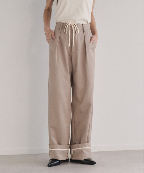 -2026SOYEN SPRING COLLECTION - ◆DETAIL・カジュアルすぎない、細かい綺麗めツイル素材を使用したカジュアルパンツです。 ・薄すぎず、厚すぎないちょうど良い肉感で、オールシーズンでの着用が可能です。 ・裾の裏側をバイカラーのパイピングで仕上げているため、ご自身のお好みの丈に合わせてロールアップしてご着用いただけるデザインになっています。そのため、予め丈を長めにしたデザインになっています。 ・ウエスト内側にはバイカラーの紐がついており、ベルトをわざわざつけなくても、ウエストサイズの調整が可能になっています。 ・ウエスト内側の紐は内側にしまっていただいても、前に出してスタイリングのアクセントとしてもご着用いただけます。 ・ワンタックのスッキリとしたストレートシルエットで、体型問わず、様々な洋服と合わせやすいシルエットになっています。 ◆STYLE ・パンツのデザインを主役にするなら、トップスはミニマルなTシャツやタンクトップをインするのが正解。SY0203のタンクトップを使用。 ・足元はポインテッドトゥのパンプスやヒールのあるサンダルを合わせると、裾のボリューム感とのコントラストでよりモードな印象に。 ・あえてオーバーサイズのジャケットを羽織り、マニッシュなセットアップ風の着こなしを楽しむのも今季らしくておすすめです。 【カラー展開】ベージュ、ネイビー 【サイズ展開】F …………………… 透け感:なし 厚さ:厚め 伸縮性:なし 裏地:なし ポケット:あり …………………… ◆着用レビュー 【スタッフA 155cm/45kg/骨格ウェーブ】 裾にボリュームがあるので、コンパクトなトップスを合わせるとバランスが取りやすいです!低身長ですが、ハイウエストのおかげで重たく見えず、こなれた雰囲気で履けました。 【スタッフB 162cm/52kg/骨格ストレート】 タックが綺麗に入っているので、ワイドパンツ特有の着太りが気になりません。裾のデザインが個性的で、歩くたびにラインが見えるのがとても可愛いです。 ◆キーワード ・ワイドパンツ ・ロールアップパンツ ・裾デザイン ・ラインパンツ ・タックパンツ ・チノパンツ ・スラックス ・体型カバー ・モードカジュアル ・大人カジュアル ・春服 ・夏服 ◆SNS お得な情報を配信してます。 ぜひコーデの参考にしてみてください! 【公式 Instagram】 @soyen_official 【公式 TikTok】 @soyen_official …………………… SOYEN/ソイエン Neutral Mode 飾らず、意思をまとう。 シンプルなラインの中に、少しの構築性と緊張感。 マニッシュでも、冷たくない。 女性らしさを「足す」のではなく、「残す」ブランド。 -都会に生きる大人のための、静かで強いデイリーウェア- …………………… ※着用身長によって画像イメージと異なる場合があります。 ※撮影環境により、実際のカラー、形状、デザイン等多少異なる場合がございます。 《 お知らせ 》 ▼商品のお気に入り登録 お気に入りアイテムの値下げ・再入荷・在庫1点などの通知を受け取ることができます。 ▼ブランドのお気に入り登録 新商品や再入荷、セール、クーポン配布などお得な情報を受け取ることができます。 是非、お気に入り登録してみてください♪ ※他のキャンペーンにより、期間中に価格が変動する場合があります。 ※セールは予告なく終了させていただく場合もあります。 ※ご注文いただいた予約商品のお届け時期の確認は、注文履歴ページより行えます。
