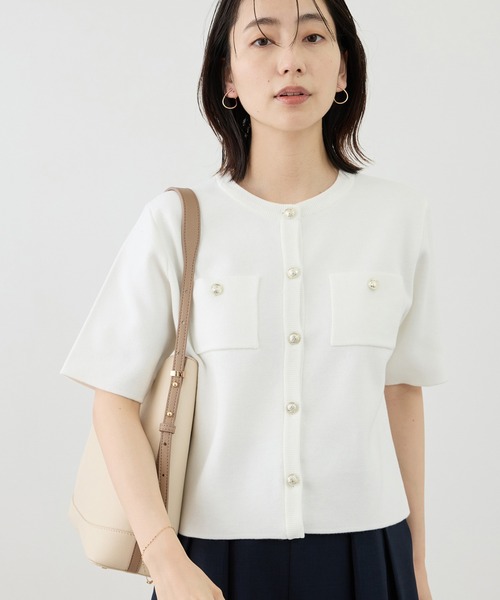 人気のミラノリブシリーズから半袖が登場! : 【素材】 ・ポリエステル×アクリル素材を使用した、ミラノリブ編み。 ・しっかりとした肉感とハリがあり、型崩れしにくく、立体的で美しいシルエットをキープ。 ・手持ち感のある上質な編み地で、きちんと感のある仕上がり。 ・再生ポリエステルを使用した、サステナブルなアイテム。 【デザイン】 ・ショート丈×半袖のバランスが新鮮な、ジャケットライクなニットトップス。 ・コンパクトなフォルムに、フロントの金ボタンがアクセント。 ・シンプルながらも存在感があり、一枚で着映えるデザイン。 ・前を留めてトップスとしても、軽い羽織としても活躍する万能アイテム。 【カラー】 ・オフホワイト、黄緑、ネイビー、サックスの全4色展開。 ・スタイリングに程よい華やかさをプラスしつつ、オンオフ問わず活躍。 【スタイリング】 ・ワイドパンツやセンタープレスパンツと合わせれば、洗練されたきれいめスタイルに。 ・デニムやスカートと合わせてカジュアルダウンも楽しめる。 ・トップス感覚でも羽織としても使える、着回し力の高い一枚。 ---------------------------- 裏地:なし 光沢感:なし 透け感:なし 伸縮性:あり ファスナー:なし ポケット:あり ボタン:あり(開閉可) 生地の厚さ:普通 季節:春、夏 ----------------------------- ※撮影時の光、お使いのモニター環境によって色の見え方が違う場合がございます。 ※2025年秋冬商品より、ワンサイズ展開の商品は「F(フリーサイズ)」表記に変更しております。 詳しい採寸はサイズ欄をご覧ください。 【モデル着用サイズ】 身長:160cm 着用サイズ:F 【2026 Spring/Summer】【26SS】