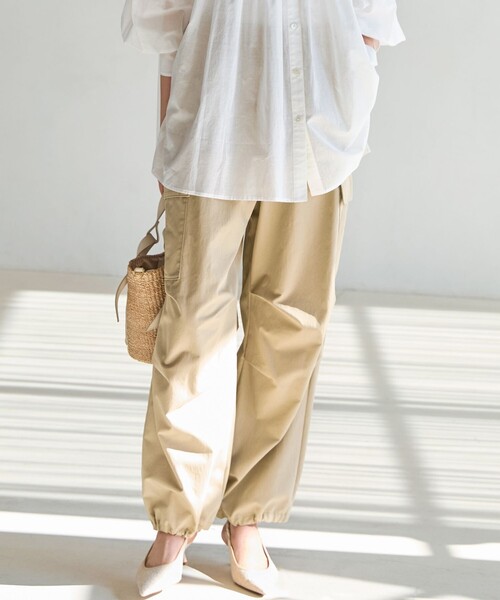 2026 Spring & Summer SLOW 23区 スローな1日に纏うものは、快適で美しいものがいい。安らぎを与えてくれる素材と仕立てで、気張らず自由におしゃれを楽しめるカジュアルウェア。 ■デザイン 大人が着こなせるよう洗練された雰囲気に仕上げた、パラシュートカーゴパンツです。雪上カモフラージュ用のミリタリーパンツであるスノーカモパンツのディテールをベースに、ハリ感のある素材を用いることで立体的でゆったりとしたボリュームシルエットを表現しました。裾のドローコードを絞ることでシルエットに変化をつけられ、合わせるシューズや気分によって着こなしのアレンジを楽しめます。コンパクトなトップスと合わせてメリハリをつけたり、シャツやニットと合わせたリラックススタイルなど幅広いコーディネートに活躍します。体のラインを拾わないサイズ感で気負わず穿けるのも嬉しいポイントです。カラーは、どんなコーディネートにも馴染む柔らかなベージュ系(#033)と深みのある色合いがシックな印象を与えるモスグリーン系(#053)の2色展開です。 ■素材コットンとナイロンを高密度に織り上げた、丈夫な生地を使用しています。仕上げに特殊な加工を施すことでナチュラルなシワ感とさらりとしたドライな肌触りを実現しました。さらに、製品として仕上がった後に洗いをかけることで、より味わい深いカジュアルな質感を引き出しています。程よい張り感がありながらも着心地は軽くデイリー使いに最適な素材感です。 ■同シリーズ ハイカウントギャバ ミリタリージャケット(品番:JKRSWLM0930) ※画像はサンプルを使用している為、実際にお届けする商品と仕様が異なる場合がございます。 ※サンプルはモデルサイズを使用している為、実際の商品のサイズはサイズ詳細の実測をご参照ください。 洗濯表示 【本体のみ】40℃まで弱洗濯可 塩素系漂白不可 タンブル乾燥不可 日陰つり干し乾燥 アイロンは120℃まで ドライクリーニング(石油系)可 弱いウェットクリーニング可