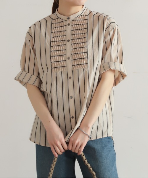 【NOMBRE IMPAIR ノンブルアンペール】 2026 Summer Collection / pre order ■ツイストデザインで品よく差がつく一枚 フロントに施したツイストタックが目を引くデザインシャツ。 コットン100%のナチュラルな風合いに、ストライプの縦ラインがすっきりとした表情。 カジュアルさの中にほんのりドレスライクなムードを感じるバランスに。 肘にかかる半端袖で、軽やかさと安心感のある丈感。 袖を折り返して抜け感を出したり、ウエストインでメリハリをつけるのもおすすめです。 ■Coordinate ワイドデニムにさらりと合わせてラフに、前を開けて羽織りとしても◎ スラックスやテーパードパンツと合わせれば、ほどよくきちんと感のある大人カジュアルに。 オンオフ問わず、ロングシーズン活躍する使い勝手の良い1枚です。 洗濯:洗濯機使用可 ※画像の商品はサンプルです。 実際の商品と色味、仕様、サイズ等が若干異なる場合がございます。 ※工場の生産の都合上、納期が変更になる場合がございます。 発送日の前後については予めご了承ください。