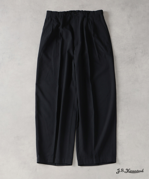 TWSHADOW INFLATION SLACKS 尾州産のポリエステル混ウールストライプを使用し、さりげない撚杢ストライプが奥行きある表情を生み出す一本。 腰回りからワタリにかけてゆとりを持たせつつ、前裾ダーツで裾幅をシャープに絞ることで、丸みのある立体的なシルエットを構築している。 今シーズンはワタリのボリュームを見直し、リラックス感を保ちながらもより洗練されたバランスにアップデート。スラックス専業工場による丁寧な縫製が、全体に清潔感と品の良さをもたらし、気負わず穿けてスタイルを整えてくれる汎用性の高い仕上がりとなっている。 【J.S.Homestead / ジェイ エス ホームステッド】 アメリカンカジュアル・ヴィンテージウェアを熟知するからこそのノウハウを駆使し、時流を取り入れた商品を展開することで、 その人の様々なシーンに対応できる ウェア、もしくは他者からの共感が得られ影響の与えられる現代的なスタイリング を提案するブランド。 ※取り扱いについては、商品についている品質表示でご確認ください。 ※照明の関係により、実際よりも色味が違って見える場合があります。またパソコン・スマートフォンなどの環境により、若干製品と画像のカラーが異なる場合もございます。 ※商品の色味は、商品アップ画像をご参照ください。 本体:ドライクリーニング