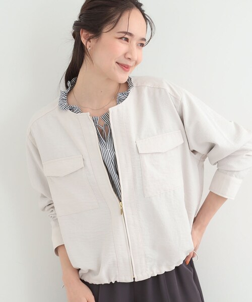 【デザイン】 フロントの大きめフラップポケットがポイントのノーカラーブルゾン。 程よい厚さのサラッとした素材感で、楽に羽織っていただけます。 裾のドロスト仕様でシルエット調整ができ、コーデに合わせて変えられるのも魅力です。 ノーカラーデザインで首まわりもすっきりと見せてくれ、 ゴールドの金具が更なる上品さを演出します。 【スタイリング】 デニムやワイドパンツと合わせた大人カジュアルはもちろん、 スカートやワンピースに合わせたきれいめフェミニンスタイルにもマッチします。 かさばらずシワになりにくいので持ち運びしやすく、通勤にもおすすめです。 フレアスカートやワイドパンツなどボリュームのあるボトムを合わせる際は 裾を絞っていただくとバランスよく着ていただけます。 また大きなフラップポケットなどシンプルながら特徴のあるアウターなので、 いつものインナーにさっと羽織るだけで、こなれ感のあるコーデが完成します。 【素材】 ツイル目のあるサラッとしたシャツ素材を使用しています。 【仕様】 ・ポケット数:前×2 ・裏地なし ※照明の関係により、実際よりも色味が違って見える場合があります。また、パソコン・スマートフォンなどの環境により、若干製品と画像のカラーが異なる場合もございます。 モデル情報:身長163cm B81 W59 H88 着用サイズ:02(M) 店舗へのお問い合わせ商品番号:C62-45313 ●製品寸法: 01(S):着丈53cm B121cm 袖丈53cm 肩幅46cm 02(M):着丈54cm B124cm 袖丈54cm 肩幅47cm 03(L):着丈55cm B127cm 袖丈55cm 肩幅48cm 04(LL):着丈56cm B130cm 袖丈56cm 肩幅49cm 備考:重量:約295g(サンプルサイズ)