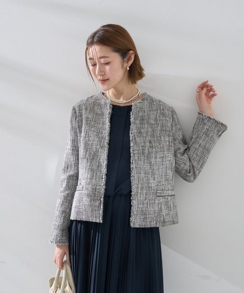 上品さと華やぎを両立する万能ツイード 表情豊かなツイード素材が、装いに奥行きと品格を与えるノーカラージャケット。 繊細な織りがさりげなく華やかさを演出し、きちんとした印象を大切にしたい場面にも安心して取り入れられます。 ノーカラー仕様ですっきりとした首元はブラウスやカットソーとの相性も良く、着こなしの幅が広がります。 程よい丈感と直線的なシルエットが全体をバランス良くまとめ、パンツにもスカートにも合わせやすいのが魅力。 フォーマルなシーンでは上品に、デニムなどと合わせれば綺麗めカジュアルにも活躍します。 オンオフを問わず着回せる頼れるアイテムです。 【カラーバリエーション(オフホワイト)】 ツイードジャケット(2)(07001332900) 透け感[なし] 生地の厚さ[普通] 光沢感[ややあり] 伸縮性[なし] 裏地[あり] ポケット[あり] ------------------------------------------- ●YECCA VECCA● (イェッカ ヴェッカ) 「大人のハッピーモードな着映え服」 毎日を自分らしく、ハッピーに過ごすことにポジティブな女性のためのリアルクローズ。キーワードは「遊び心のある、女性らしいモード服」でも「コンフォート」。 都会的で女性らしいムードを大切に着ていて心地よく、気持ちが上向きになるような遊び心のあるデザインウェアをラインナップ。 自分自身がわくわく出来る洋服で日常を最大限に楽しむ大人の為のスタイルを提案していきます。 ▼商品のお気に入り登録がおすすめです ▼ 商品ページ内のハートマークをクリック。完売時の再入荷や、最後の1点の通知、コーディネート画像がアップされたとき、お得なお値下げの際の通知を受ける事ができます。 【お知らせ】ページでも通知が確認できます。 -------------------------------------------