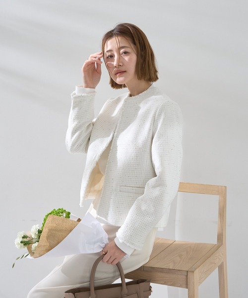 清らかな華やぎをまとうツイードスタイル 繊細な表情を持つツイード素材が、装いに上品さと華やかさを添えるジャケット。ノーカラーのデザインが首元をきれいに演出し、ブラウスやワンピースとの相性抜群。 程よい丈感で全体のバランスが取りやすく、フォーマルな場面ではきちんと感を、日常では洗練された雰囲気を演出します。 セレモニーシーンから普段のお出かけまで幅広く活躍する、頼れる一着です。 透け感[なし] 生地の厚さ[普通] 光沢感[ややあり] 伸縮性[なし] 裏地[あり] ポケット[あり] 【カラーバリエーション(ネイビーとミックス)】 ツイードジャケット(1)(07001332800) ------------------------------------------- ●YECCA VECCA● (イェッカ ヴェッカ) 「大人のハッピーモードな着映え服」 毎日を自分らしく、ハッピーに過ごすことにポジティブな女性のためのリアルクローズ。キーワードは「遊び心のある、女性らしいモード服」でも「コンフォート」。 都会的で女性らしいムードを大切に着ていて心地よく、気持ちが上向きになるような遊び心のあるデザインウェアをラインナップ。 自分自身がわくわく出来る洋服で日常を最大限に楽しむ大人の為のスタイルを提案していきます。 ▼商品のお気に入り登録がおすすめです ▼ 商品ページ内のハートマークをクリック。完売時の再入荷や、最後の1点の通知、コーディネート画像がアップされたとき、お得なお値下げの際の通知を受ける事ができます。 【お知らせ】ページでも通知が確認できます。 -------------------------------------------