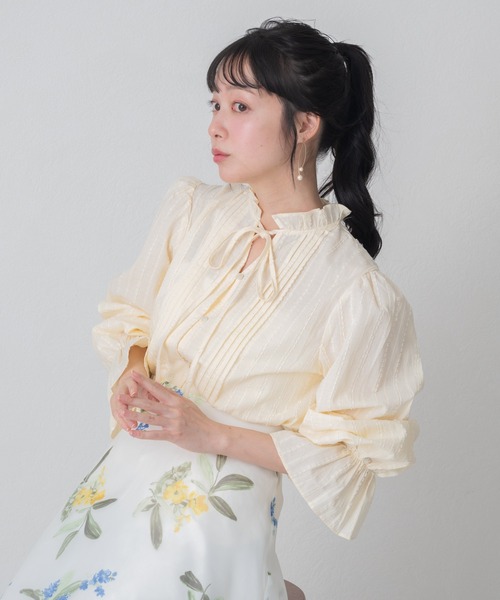2026 Spring&Summer ItemWEB限定 繊細なディテールで魅せる、上品ブラウスフェミニンな雰囲気を引き立てる一枚です 【 design 】フロントのピンタックと リボンディテールが印象的なブラウス。縦ラインを強調するデザインで、 すっきりとした見え方に仕上げました。 程よくボリュームを持たせたスリーブが、 女性らしい柔らかな印象をプラス。シンプルながらも華やかさのあるデザインで、 オン・オフ問わず活躍します。 【 styling point 】スカート合わせでフェミニンにまとめるのはもちろん、きれいめパンツと合わせた通勤スタイルにもおすすめです。 ジャケットやカーディガンのインナーとしても使いやすく、ロングシーズン着回しをお楽しみいただけます。 ----------透け感 ややあり裏地 なし伸縮性 なし生地の厚さ 薄手---------- ♡手洗いOK ※ご覧のモニター環境や光の照射・角度により、画像の色味と多少異なる場合がございます。ご了承ください。 【 お買い物をお楽しみいただく為に 】▼お気に入り登録をオススメします。 『♡』をクリックすると…・《商品のお気に入り登録》で再入荷通知や ラスト1点の通知、セールやクーポンの通知も 受け取ることができます。・《ブランドのお気に入り登録》で新作商品や再入荷など、 お得な情報を受け取ることができます。