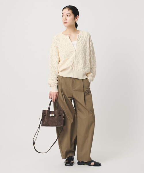 WEB限定 Wardrobe DAILY MINIMAL カジュアル、仕事、オケージョンなど、さまざまなシーンで活躍するウェアを軸に、 着回しやすくミニマルスタイルが叶う “Wardrobe DAILY MINIMAL”。 シンプルながら抜け感のあるデザインは、洗練された女性に向けておすすめです。 デイリーづかいしやすい快適な着心地を求めて素材選びからこだわりました。 透かしレース編みでシーズンムード高まるカーディガン ■デザイン 春らしさを引き立てる透かし柄のレース編みが目をひくニットカーディガン。 フロントジップを取り入れることで、デザインだけでなく着こなしの幅も広がり、好みや気温に合わせたアレンジが楽しめます。 ジップを閉じてプルオーバーのように着れば、ほどよくカジュアルなスウェットライクな表情に。 少し開ければスキッパー風の抜け感が生まれ、さらに全開にして羽織れば軽やかなカーディガンとしてシーズン長く活躍してくれます。 ワードローブに加えるだけでデイリーコーデの幅が広がる万能な一着です。 ■素材 柔らかなコットン糸をレース柄に編立てました。 ご自宅での手洗いも可能な利便性の高さも魅力です。 ■コーディネート スラックスやワイドパンツなどマニッシュなアイテムを添えたカジュアルスタイルから、スカート合わせのきれいめカジュアルまで幅広く合わせられるアイテム。 編み柄からさりげなく覗く肌見せが上品なカジュアルスタイルに導いてくれます。 ============================ 裏地:なし 透け感:あり 光沢感:なし ケア方法:手洗い可 ============================ 【注意事項】 ※商品に「取り扱い上の注意書き」、「洗濯表示」がございます場合は、使用前に必ずご確認ください。 ※商品画像は、光の当たり具合やパソコンなどの閲覧環境により、実際の色味と異なって見える場合がございます。あらかじめご了承ください。 ※画像の商品はサンプルです。 お問い合わせの際は、ユナイテッドアローズ カスタマーサービスデスクまで下記の品名/品番をお申し付け下さい。 品名:★by WDM LACE ZIP CD 品番:16286000002