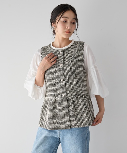 立体感で魅せる、ペプラムジレ 表情豊かなツイード素材に、ペプラムシルエットを組み合わせたジレ。 ウエスト位置の切り替えが自然な立体感を生み、さりげなくスタイルアップを叶えます。 コンパクトな上身頃と広がりすぎないペプラムラインが、甘さを抑えたモードな印象に。 ボタンディテールがアクセントとなり、上品さの中に程よい存在感を演出します。 パンツにもスカートにも合わせやすく、セレモニーシーンにはもちろん、日常使いにも対応できる万能なアイテムです。 透け感[なし] 生地の厚さ[普通] 光沢感[ややあり] 伸縮性[なし] 裏地[あり] ポケット[なし] ※モデル着用画像は、光の当たり具合で色味が違って見える場合がございます。 ※お使いのモニター環境によって商品の色味が違って見える場合がございます。 ------------------------------------------- ●YECCA VECCA● (イェッカ ヴェッカ) 「大人のハッピーモードな着映え服」 毎日を自分らしく、ハッピーに過ごすことにポジティブな女性のためのリアルクローズ。キーワードは「遊び心のある、女性らしいモード服」でも「コンフォート」。 都会的で女性らしいムードを大切に着ていて心地よく、気持ちが上向きになるような遊び心のあるデザインウェアをラインナップ。 自分自身がわくわく出来る洋服で日常を最大限に楽しむ大人の為のスタイルを提案していきます。 ▼商品のお気に入り登録がおすすめです ▼ 商品ページ内のハートマークをクリック。完売時の再入荷や、最後の1点の通知、コーディネート画像がアップされたとき、お得なお値下げの際の通知を受ける事ができます。 【お知らせ】ページでも通知が確認できます。 -------------------------------------------