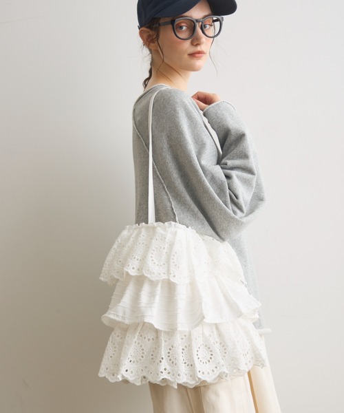 【ナチュラルなカットワークレースのフリルが目を惹くトートバッグ】 ・持つだけでアクセントになるフリルデザインのバッグ ・カットワークレースとフリンジボーダーの生地を組み合わせた華やかさポイント ・500mlペットボトルや財布など必需品もしっかり入る大きさ ・内側にポケット付きで小物収納も○ ~スタイリング~ ナチュラルコーデに合わせるのはもちろん、カジュアルなスタイリングに取り入れることで程よく甘さがありコーデのポイントになります。 フリルに華やかさがあるのでシンプルなコーデの日でも映えるアイテム。 程よい大きさでデイリーに活躍の1点です。 - - - - - - - - - - - - - - - - - - - - - - - - - - - - - - - - - 透け感:なし 厚さ:普通 光沢感:なし 伸縮性:なし 裏地:なし ポケット:内側×1 洗濯:自宅洗濯可能(ネット使用推奨) - - - - - - - - - - - - - - - - - - - - - - - - - - - - - - - - - ※着用、お取り扱いの際は、商品についている品質表示とアテンションタグを必ずご確認下さい。 オールシーズン/フリルバッグ/コットンレース/レースバッグ/大人ナチュラル