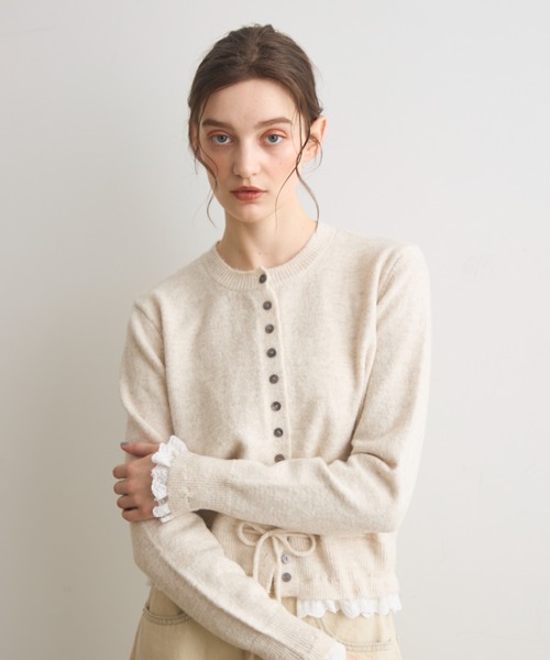 【さりげないカットワークレースがアクセントのニットカーディガン】・メランジのミックス糸が淡くふんわりとしたイメージを演出・もちっとした風合いで春先にぴったりの1枚・ぴったりしすぎないゆるさで細見えも○・たっぷり付いた貝ボタンもアクセント・ウエストしぼってシルエットを変えた着こなしもおすすめ~スタイリング~デニム合わせで大人カジュアルにも、スカートとフェミニンにも着回せる万能アイテム。ボタンを開けてワンピースの上から羽織っても◎デザイン性のあるアイテムなので1枚でサマになる、この春大活躍のカーディガンです。- - - - - - - - - - - - - - - - - - - - - - - - - - - - - - - - - 透け感:なし厚さ:普通光沢感:なし伸縮性:あり仕様:前ボタン開き洗濯:ドライクリーニング推奨- - - - - - - - - - - - - - - - - - - - - - - - - - - - - - - - - ※着用、お取り扱いの際は、商品についている品質表示とアテンションタグを必ずご確認下さい。 春服/大人ナチュラル/淡色/フェミニン/ニットカーディガン