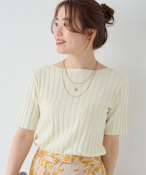すっきりとしたボートネックが上品な印象のハーフスリーブニット。ワイドリブ編みで、程よくフィットしながらも体のラインを拾いすぎない絶妙なシルエットです。滑らかな素材感でさらりとした肌あたりで、ロングシーズン活躍します。手洗い可能なのもデイリーにうれしいポイントです。オンオフに使える万能トップスです。 ※取り扱いについては、商品についている洗濯表示にてご確認下さい。 ※照明の関係により、実際よりも色味が違って見える場合があります またパソコン・スマートフォンなどの環境により、若干製品と画像のカラーが異なる場合もございます。 ※商品の色味は、商品アップ画像をご参照ください。 【注意事項】 ・画像の商品はサンプルです。 ・サイズ表記はあくまで目安となります。 実際の商品と仕様、加工が若干異なる場合があります。