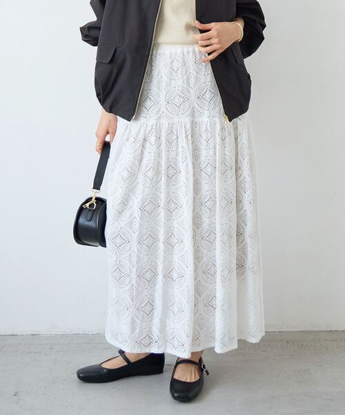 幾何柄と花柄を組み合わせたレースが目を惹く程よい分量のティアードデザインのギャザーキリカエスカート。●ポイント生地に厚みがあるため、ボディラインを拾いにくく腰まわりはすっきりさせ、切り替えのラインを後ろ下がりにしているため、横からの見ためも動きがでてポイントです。やや前上りのヘムラインは、軽やかさも演出してくれます。●おすすめコーデジャケットできれいめのスタイリングからデニムなどカジュアルなアイテムとの相性も◎※取り扱いについては、商品についている洗濯表示にてご確認下さい。※照明の関係により、実際よりも色味が違って見える場合がありますまたパソコン・スマートフォンなどの環境により、若干製品と画像のカラーが異なる場合もございます。※商品の色味は、商品アップ画像をご参照ください。【注意事項】・画像の商品はサンプルです。・サイズ表記はあくまで目安となります。実際の商品と仕様、加工が若干異なる場合があります。
