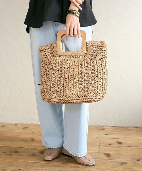 ウッドハンドルがポイントのトートバッグ。本体をすっきりとしたスクエア型と透かし編みにしてスタイリッシュで涼しげな印象に仕上げました。シンプルながらも存在感のある見た目でコーディネートのアクセントにおすすめです。 ※取り扱いについては、商品についている洗濯表示にてご確認下さい。 ※照明の関係により、実際よりも色味が違って見える場合があります またパソコン・スマートフォンなどの環境により、若干製品と画像のカラーが異なる場合もございます。 ※商品の色味は、商品アップ画像をご参照ください。 【注意事項】 ・画像の商品はサンプルです。 ・サイズ表記はあくまで目安となります。 実際の商品と仕様、加工が若干異なる場合があります。