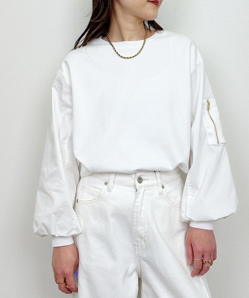 さり気なく目を引くポケット付きパフスリーブプルオーバー身頃に、柔らかく滑らかな肌触りのコットンブレンドのカットソー生地を使用。袖と脇下には、程よいハリのある同色の布帛生地を合わせ、さりげない立体感を演出。ふんわりとしたパフスリーブが女性らしさを添えつつ、甘くなりすぎないのが大人に嬉しいポイント。クルーネックとリブの襟元、袖口が全体をすっきりまとめます。左袖のポケットデザインが、ほどよい遊び心に。前後差のあるラウンドヘムで、パンツにもスカートにも好相性。一枚でサマになるのに、気負わない。大人のカジュアルに、ちょうどいい主役トップスです。【詳細情報】厚み:□薄手 ■ふつう □厚手透け感: ■なし □あり(オフホワイト少しあり)光沢感: ■なし □あり伸縮性: □なし ■あり(身頃のみあり)裏地: ■なし □ありポケット:■なし □あり重量: 約280g※撮影場所や明るさにより実際の商品と色味が若干異なる場合がございます。 ☆商品のお気に入り♡登録を押せば”再入荷通知”や”残りわずか通知” 値下げのお知らせが届きます!お気に入りのブランド登録していただければ新商品入荷のお知らせも届きますので是非登録してみて下さい。