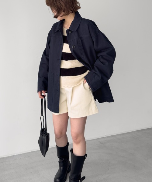 デザイン ワークテイストでこなれ感のあるツイルジャケット。 あえてオーバーサイズの作りにしているので、ざっくり羽織れて抜け感をプラス。 素材 程よい厚みのコットンツイル素材で肌触りも滑らかです。 コーディネート 3シーズン着ていただけるので、着用頻度が高くなること間違いなしの万能ジャケット。 ボリュームのあるトップスの上からでも着心地を損なわず、スタイリングをお楽しみいただけます。 ------------------------------------- 生地の厚さ:厚い〇〇●〇〇薄い 伸縮性:なし 透け感:なし 裏地:あり 光沢:なし ・3ポケット ------------------------------------- 取扱い ・蛍光増白剤が入っていない洗剤をご使用ください。 ・クリーニングネットをご使用ください。 ・濃い色と白 ・淡色物は分けて洗ってください。 ・洗濯で多少縮むことがあります。洗濯後はすばやく形を整えて干してください。タンブラー乾燥はお避けください。 ・アイロンの際は当て布をご使用ください。 ・着用時の汗や摩擦により、他の衣類や鞄などに色移りすることがありますので、淡色系との着合わせはご注意ください。 ・摩擦や引っかけにご留意ください。 ※取り扱い及びお手入れ方法については、商品についている取扱表示、洗濯表示にてご確認下さい。 ※照明の関係により、実際よりも色味が違って見える場合があります。またパソコン・スマートフォンなどの環境により、若干製品と画像のカラーが異なる場合もございます。 ※商品の色味は、商品アップ画像をご参照ください。