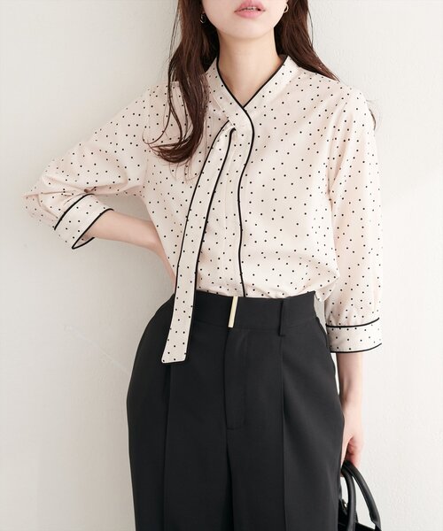 【2026SS natural couture】 ねじり配色ボウタイブラウス ■Design シンプルでありながら、コーディネートがきちんと上品に仕上がります。 襟と袖口にはパイピングデザインが施されており、無地でも目の惹くデザイン。 オフィスシーンからカジュアル使いまで、幅広い系統で着回ししていただけること間違いなしです。 ■Styling ボトムスは厚みのあるもので合わせていただき、素材感にメリハリをつけていただくのがおすすめ。 1枚で非常に上品なデザインなので、スカート合わせはもちろん、デニム合わせでキレイめを抑えるスタイルも◎ ■Fabric さらっととろみのある素材で、コーディネートに取り入れるだけでぐっと品が出ます。 =================== お手入れ方法:手洗い 伸縮性:なし 裏地:なし 透け感:ピンクベージュ以外あり 光沢感:なし 生地感 :さらりとした生地感 =================== ※着用、お取り扱いの際は、商品に付いている品質表示とアテンションタグを必ずご確認ください。 【お気に入り登録でお得な情報がいっぱい】 ・「商品のお気に入り登録」で再入荷通知や、ラスト1点の通知、セール通知をいち早く受け取ることができます。 ・「ブランドのお気に入り登録」で新商品や再入荷など、お得な情報を受け取ることができます! ※店舗の入荷時期は商品によって異なります。 店頭の在庫状況につきましては各店舗にてお問い合わせください。 ※撮影時の光の関係で、画面上の画像と実際のお色とでは若干の色差が生じる可能性がございます。 また、ご覧いただいているモニター画面や、お使いのブラウザによっても、お色の違いがございますことをあらかじめご了承くださいませ。 20260227 2026SS_natu 26SS