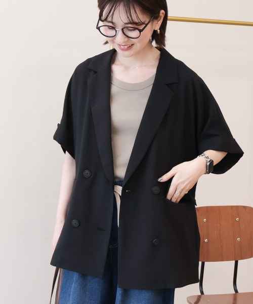 ひんやり快適、洗えるリネン風ジャケット暑い日も快適に着られる接触冷感素材を使用した半袖ジャケットです。リネンライクな表情が季節感を高め、軽やかで涼しげな印象を演出します。ダブルボタンのデザインが程よいきちんと感をプラスし、通勤コーデやオフィスカジュアルにもおすすめです。シワになりにくいイージーケア機能付きで、忙しい毎日でもお手入れが簡単です。ゆったりとしたシルエットで動きやすく、体型カバーも叶います。カットソーやブラウスの上にさっと羽織るだけで、旬の大人カジュアルスタイルが完成します。デイリーからお出かけまで幅広く活躍する一着です。■素材について・接触冷感接触冷感性のある素材を使用しているため、触れた瞬間ひんやり感じます。・イージーケアシワになりにくい素材を使用しております。洗濯ジワが付きにくくお手入れが簡単です。洗濯用ネットを使用し、短時間脱水をおすすめします。透け感[なし]生地の厚さ[普通]光沢感[なし]伸縮性[なし]裏地[なし]ポケット[あり]※サンプルで撮影しております。※モデル着用画像は、光の当たり具合で色味が違って見える場合がございます。※お使いのモニター環境によって商品の色味が違って見える場合がございます。●AMERICAN HOLIC ● (アメリカンホリック)大人の女性の毎日を軽やかで豊かにするブランド。カジュアルなのにオシャレ、コーディネートも楽。ONにもOFFにも等身大で楽しむオトナの日常着をテーマに、スタイリッシュかつ自然体を楽しめるカジュアルスタイルを提案します。 ▼ 商品のお気に入り登録がおすすめです ▼商品ページ内のハートマークをクリック。完売時の再入荷や、最後の1点の通知、お得なお値下げの際の通知を受ける事ができます。【お知らせ】ページでも通知が確認できます。