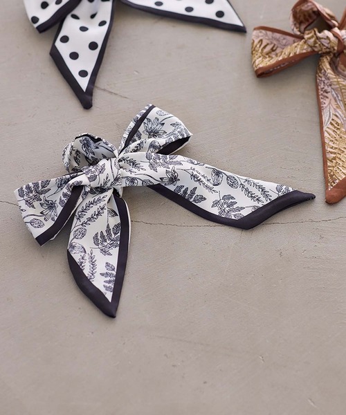 【2026 Spring】【26SS】 <POINT> ・コーディネートのアクセントになる、上品な柄デザイン ・細めのナロー幅で取り入れやすく、さっと巻くだけでこなれた印象に ・首元やバッグ、ヘアなど、マルチに使える汎用性の高いアイテム 【カラー】 ホワイト(ドット柄)、オフホワイト系(線画フラワー柄)、ブラウン系(リーフ柄)の3色展開。 【おすすめのスタイリング】 首元に軽く巻いてきれいめスタイルのポイントにしたり、バッグのハンドルに結んでアクセ感覚でプラスするのもおすすめ。ポニーテールやまとめ髪に取り入れて、さりげなくフェミニンさを添えるアレンジも楽しめます。 ※画像の商品はサンプルです。 実際の商品と仕様、加工、サイズが若干異なる場合がございます。