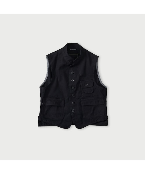 擦り切れるほどかっこいいハンティングやワークウェアとして使われてきたダックは目が詰まった、ハリのあるコットンです。これでもかと打ち込みを上げてさらに高密度に織ったあと、はじめは少し硬く感じるかもしれませんが、着て、洗ってをくりかえすたびに柔らかく馴染み、深染めのインディゴも褪せどんどんカッコ良くなる素材です。どんなボトムスにも合わせやすい着丈とフロントのボタンがアクセントちょこんとついたフラップポケットも可愛い着こなしの主役になるベストです。