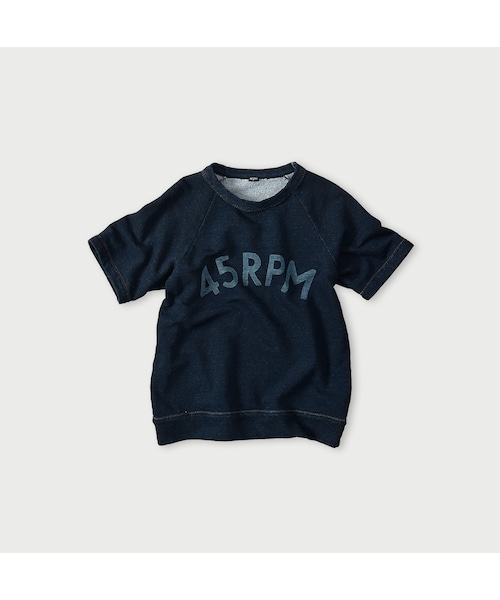 ざっくりふっくら3種の太さの違う糸を紡いで鮮やかなインディゴで染めてから裏毛よりもさらに甘く、柔らかく編み立てました。ざっくりドライタッチな肌あたりを残した軽やかでふかふかのガーゼ裏毛です。ヴィンテージスウェットのようなラグランハーフスリーブのかたちに大きくロゴプリントを抜染しました。重ね着もおすすめです。