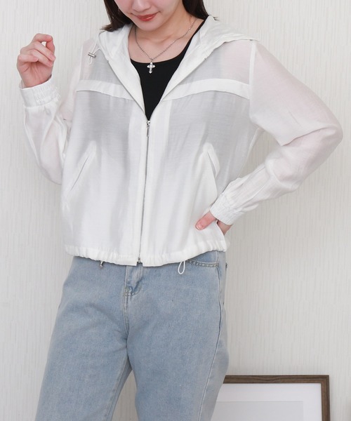 ほんのり透ける軽やかな素材感が魅力シアーフードマンパ―が新登場。■pointカジュアルな印象のマンパーを、落ち感のある素材で女性らしく仕上げました。一枚羽織るだけで、きれい見えするアイテムです。ほど良い身幅で、バランスよく整うシルエットは、もたつかずすっきりとした印象に。薄くて軽いシアー素材は、持ち運び楽ちん。さらっと羽織れて、季節の変わり目や冷房対策にも活躍。パンツにもスカートにも合わせやすい、着回し力の高い一枚です。■detail透け感のある軽やかな素材。重たく見えず、春から初夏までロングシーズン活躍します。さっと羽織れてデイリーに使いやすいフルジップデザイン。裾のドローストリングでシルエット調整が可能。きゅっと絞れば丸みのある女性らしいフォルムに。袖口ゴム仕様よいフィット感で腕まくりもしやすく、抜け感のある着こなしが完成します。■fabricナイロンの軽さと丈夫さに、レーヨンのなめらかさをプラス。落ち感を兼ね備えた、微光沢のある上品な風合いが特徴です。……………………透け感:あり厚さ:薄い裏地:なし光沢感:微光沢伸縮性:なしポケット:あり洗濯方法:家庭用洗濯機NG・ドライクリーニング・ウェットクリーニングNG……………………※ネットに入れてのお洗濯をお勧めいたします。※詳しいお手入れ方法は商品タグをご参照ください。■coordinateブラウス×きれいめパンツに羽織れば、通勤や学校行事にも使える上品コーデに。シンプルなトップス×デニムに合わせるだけで、微光沢素材がカジュアルをきれいめに格上げ。ワンピースやサロペットの羽織としても好相性。ショート丈なのでバランスよく着こなせます。■wearing scene通勤 オフィスウェア 旅行 お出かけ 公園 ママ行事 運動会 アウトドア ドライブ ショッピング ランチ会 女子会------------------------------ライトアウター 羽織り シアー パーカー カジュアル 冷房対策 日よけ 軽量 オフィスカジュアル 長袖 透け感------------------------------