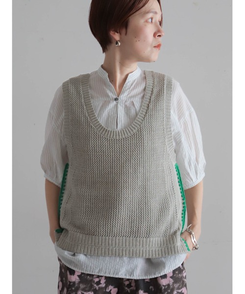 【FIL DE FER フィルデフェール】 2026 Summer Collection / PRE ORDER “ひとすじのカラーが効く” シンプルになりがちな春夏コーデの印象チェンジに重宝するベスト。 綿と綿麻を撚った糸は、どこか粗野でメランジライクな表情。 脇に入れたシェル刺繍が、色・質感ともにアクセントになっています。 レイヤードしてもシルエットがふくらまない、コンパクトなサイジングがこだわり。 また深めのUネックで、Tシャツのロゴがチラリとのぞくバランスもポイントです。 洗濯:手洗い可 ※画像の商品はサンプルです。 実際の商品と色味、仕様、サイズ等が若干異なる場合がございます。 ※工場の生産の都合上、納期が変更になる場合がございます。 発送日の前後については予めご了承ください。 ※ご注文いただいた予約商品のお届け時期の確認は、注文履歴ページより行えます。