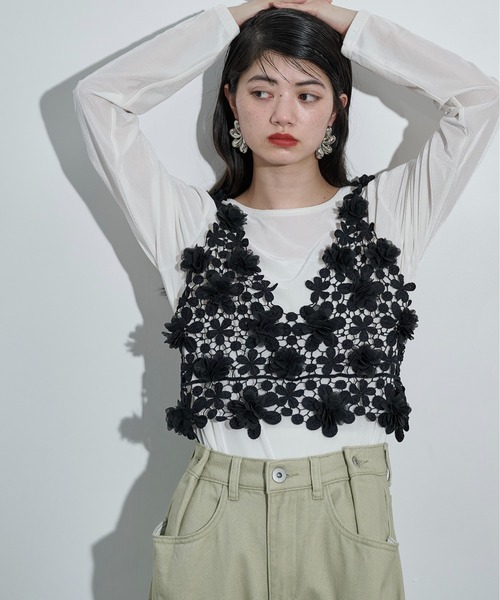THE YOn 2026 SS Collection スタイリングに華を添える、レイヤードアイテム 【Design】 フラワーモチーフを繋ぎ合わせた春らしいルックのビスチェ。 前身に飾ったチュールのフラワーモチーフで立体感をプラスし、着映えする華やかさに。 透けのある素材とざっくりとしたVネックで、軽やかな抜けを演出。 重ねることで、スタイリングに奥行をプラスしてくれるアイテム。 【Styling Point】 きれいめなシャツからカジュアルなカットソーまで、幅広いトップスとのレイヤードを楽しめます。 軽やかで爽やかな印象のオフホワイトと、スタイリングを引き締めてくれるブラックの2色をラインナップ。 ------------------ 裏地:なし 光沢感:なし 透け感:あり 伸縮性:なし -------------------- 【お買い物をお楽しみいただく為に】 ▼お気に入り登録をオススメ致します。 『♡』をクリックして下さい。 ・《商品のお気に入り登録》で再入荷通知や、ラスト1点の通知、セールの際の通知も受け取ることができます。 ・《ブランドのお気に入り登録》で新作商品や再入荷など、お得な情報を受け取ることができます。 【ATTENTION】 ※引っ掛け等により破れや、モチーフが取れる場合がございますので、十分ご注意下さい。 ※画像の商品はサンプルです。 実際の商品と色味、仕様、加工、サイズ、素材等が若干異なる場合がございます。 ※撮影場所やお使いのモニター環境により若干お色味が異なる場合がございます。 ※製品によっては染料の特性上、湿った状態や汗をかいた状態での長時間の放置、または摩擦により、他のものへ色移りする恐れがありますので、着用時にはご注意下さい。 ※風通しがよく、湿気の少ない日の当たらない場所で保管して下さい。 ※また製品加工上、お手元に届く際に匂いが生じる場合がありますが、 ご使用を続けていく事により匂いは軽減されます。