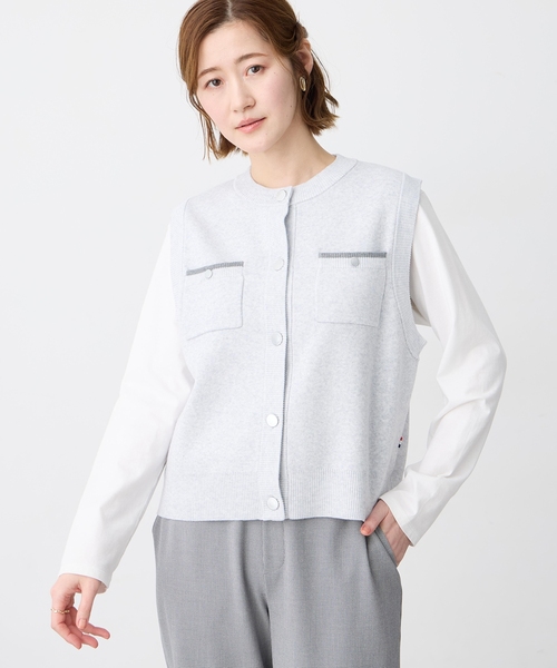 程よい厚みのニット素材で仕立てた、上品見えする胸ポケット付きベスト。フロントのメタル調ボタンと配色トリミングが、さりげないアクセントを添えます。コンパクトすぎないシルエットで、シャツやカットソーとのレイヤードもバランスよく決まる一枚。パンツにもスカートにも合わせやすく、きれいめから大人カジュアルまで幅広く活躍します。