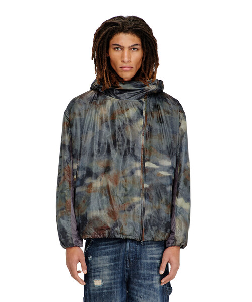 カモフラージュ柄のグラフィックを落とし込んだフード付きジャケット「J-SQUAD-BMCX」。ナイロン素材のマイクロリップストップ生地を使ったライトウェイトな仕上がりが特徴です。やや左に寄ったアシンメトリーの前立てはダブルジップ仕様になっており、スタイリングのアレンジが可能。フードと袖口、裾にはドローストリングを備え、防風性も高めました。