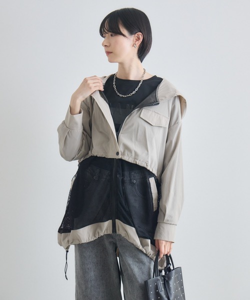 異素材が奏でる透け感 軽やかに風を纏うメッシュブルゾン <POINT> ショート丈のナイロン生地からメッシュが裾へと続くレイヤード構造が、歩くたびに軽やかな表情を生み出します。 異素材を重ねることで生まれる立体的なシルエットは、羽織るだけでこなれ感を演出し、洗練されたお出かけスタイルを叶えてくれます。 【デザイン・シルエット】 身頃全体を覆うメッシュの上に、フードから袖にかけてのナイロン生地を重ねた奥行きのあるデザインです。 本体の裾とメッシュの裾、それぞれにドロスト仕様を施しているため、絞り方次第でコクーンシルエットやフレアラインなど、自在なフォルムチェンジが可能。 【素材感】 本体にはストレッチ性に優れたポリウレタン混のナイロンを採用し、軽やかでさらっとした肌ざわりを実現しました。 メッシュ生地は、柔らかで軽やか、肌離れが良くベタつきません。 機能性とモードな表情を両立させた、ワードローブに相応しい高品質な素材使いです。 【カラー】 ブラック チャコールグレー ベージュ 3色展開 【スタイリング】 メッシュの透け感を活かし、インナーにロゴTシャツやタイトなリブタンクを合わせた奥行きのある着こなしがおすすめです。 ボトムスはスリムなパンツでシルエットを引き締めたり、落ち感のあるナロースカートで甘辛なバランスを楽しんだり。 裏地:なし 光沢:なし 伸縮性:あり 透け感:メッシュ側あり 生地の厚さ:薄手 ポケット:あり ※照明の都合上、多少の色ブレが生じてしまう可能性がございますので、予めご了承くださいますようお願い致します。 --------------------------------------------------- ●お気に入り登録でお得情報を手に入れよう! 「商品のお気に入り登録」をすると、再入荷通知や、ラスト1点の通知、セールの通知など、お得情報が届きます。 また、マイページでいつでも確認が可能になります。 「ブランドのお気に入り登録」をすると、新商品や再入荷、などいち早くブランドの最新情報をお届けします。 ぜひ、ご利用ください。 ----------------------------------------------------