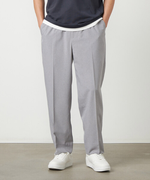 《デザイン》 デザインはリラックス感のあるワイドシルエットをベースに、 裾に向かってテーパードさせた履き心地の良いパンツです。 ウエストはゴム&スピンドル仕様にしています。 スピンドルは外出しと内出しが可能な使用にしていますので2WAYの着用が可能です。 単品での着用はもちろん、同素材展開しているブロッキングオープンカラーシャツ(商品番号:47-33IO20-206)、ブロッキング布帛Tシャツ(商品番号:47-60TO20-206)とのスタイリングもおすすめです。 《素材》 春夏のスーツに使用されるサマーウール素材のようなメランジ感のある表情と軽さが特長のポリエステル素材です。 柔らかでサラッとした風合いで、肌触りも良く、速乾性もある快適な素材です。 シワにもなりにくく、ご家庭でのお洗濯が可能な素材です。 《同素材アイテム》 シャツ(商品番号:47-33IO20-206)、Tシャツ(商品番号:47-60TO20-206)、 テーパードスラックス(商品番号:47-56PO22-206)は同じ素材のアイテムとなります。 《取り扱い注意》 強い日光(又は照明等)を長時間受けますと変色の恐れがありますのでご注意下さい。 アイロンは必ずあて布を使用して下さい。 使用している生地は非常に柔らかく、強い力が加わりますと破れたり、 裂けたりすることがありますので十分注意して下さい。 吸水速乾加工を施していますが、永久的なものではありませんのでご了承下さい。 タンブラー乾燥は禁止です。 《その他仕様》 タック本数:ノータック 裾上げについて:股下仕上げ済 ウエスト部分はゴム仕様で体にフィットしやすい伸縮性があります。 ※ウエストサイズの表記は、ゴム仕様の為、最大値まで記載しております。 …………………… 透け感:なし 厚さ:ふつう 伸縮性:あり 光沢感:なし 裏地:なし 洗濯方法:洗濯機洗い可 …………………… ※画像の商品はサンプルとなりますので実際の商品と仕様、加工、サイズが若干異なる場合がございます。 ※こちらの商品はFIVE FOXes独自の採寸方法となっています。 本サイトのサイズガイドと採寸方法が異なる場合がありますのでご了承ください。