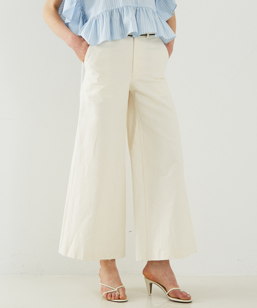 程よいハリ感があり、型崩れしにくいテキスタイルを使用。穿くだけで立体的なシルエットをキープし、上品な印象に。70年代ムードを感じさせる、股上深めのハイウエストワイドパンツ。脚をすらりと見せてくれるストレートラインと、存在感のあるウエストデザインがポイント。トップスをインすることで、ウエスト位置の高さが引き立ち、スタイルアップ効果も抜群。ブラウスやジャケットを合わせれば、きちんと感のあるモードな着こなしが完成します。【注意事項】※商品画像は、光の当たり具合やパソコンなどの閲覧環境により、実際の色味と異なって見える場合がございます。あらかじめご了承ください。※画像の商品はサンプルです。実際の商品と仕様、加工が若干異なる場合があります。※サイズ表記はあくまで目安となります。※その他の予約商品、通常商品との同時決済はできません。※入荷状況により、お届け予定が前後する場合があります。※お客様への発送が店頭販売より遅れる場合もあります。※追加生産商品は、一部の店舗、通販で販売中の場合がございます。予めご了承下さい。※商品を使用前に、タグ等に記載されている「取り扱い上の注意書き」「洗濯表示」を必ずご確認ください。※商品に不良が無い場合、包装紙および箱の彼損がございましても発送いたします。あらかじめご了承ください。