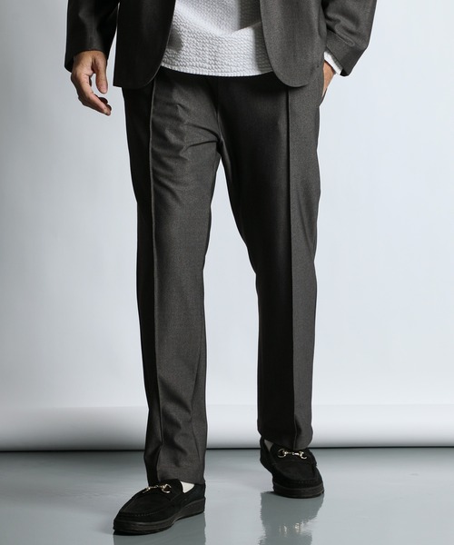 "クセのないシルエットでスタイリングにすんなり馴染む" 【生地】 程よい厚みとストレッチ性が柔軟に身体にフィットするポンチ生地を使用。 その生地にウールサージ調の柄をプリントし、まるでウールスラックスのような品のある表情を作り出しています。 見た目は上品でいながらも、ポリエステル生地特有の「軽さ」「取り扱いのし易さ」も特徴となっています。 【デザイン・ディテール】 トレンドに左右されずベーシックな太さに仕上げた、ピンタック入り(センタークリース)のスラックス。 布を小さくつまみ縫いすることでできるセンターラインは、上品できちんとした印象を与えてくれます。 また、プレスとは違い折り目が消えることなく維持できるので、アイロン掛けの手間やわずらわしさも解消しています。 その他、ウエストゴム+スピンドルの楽ちん仕様で様々な体型をフォロー。 スマートなカジュアルスタイル、ビジカジスタイル、ゴルフスタイル、オケージョンスタイルなど、多様な用途、シーンやスタイリングに活用できるボトムスです。 同素材のジャケットを展開しており、セットアップコーデもお楽しみいただけます。 セットアップ商品はこちらで検索 257090 ※完売している場合もございます。予めご了承下さいませ。 ※撮影環境による光の当たり具合やパソコン・スマートフォンなどの閲覧環境によって、実際の色味と異なって見える場合がありますので予めご了承ください。 ※商品の色味は商品単体で撮影した画像をご参照ください。 ※サンプルを着用しておりますので、実際の商品と仕様、加工、サイズが若干異なる場合がございます。 ※店頭展開のないWEB限定アイテムとなります。