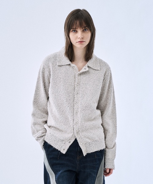 ◼︎Mulch snap knit shirts / マルチスナップニットシャツ 極端なネップ系と伸縮性と耐久性に優れたポリ糸の引き揃えで 独特な印象を出しつつも物持ちの良い素材に仕上げました。 着心地も非常に良く、ドライな質感で春に最適です。 パールスナップを狭い感覚で搭載したマルチボタン仕様で シンプルかつすっきりとしたシルエットながらも個性を出しました。 PHILTHEORY / フィルセオリー 《個性の化学反応》 それぞれが強い輪郭を持つデザイン同士が出会うことで、単体では完成しない新しい表情が生まれる。 異なる素材、シルエット、思想が混ざり合い、予測できないバランスがスタイルをつくる。 組み合わせることで、はじめて完成する服。