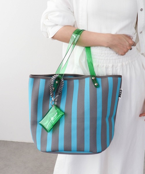 夏にぴったりの大胆なストライプが魅力のトート タオルやペットボトル・ハンディファンなど何かと荷物の増えがちな季節に使いやすい大容量なバッグ。 洗練された配色で、大人カジュアルなストライプデザインがポイント。 持ち手とお揃いの、涼しげなクリアカラーポーチ付き。 イヤホンやちょっとしたコスメを入れるのにもおすすめです。 ▼商品詳細▼ 【ポケット】外:0 内:1 【口元開閉方法】マグネット ・A4対応(22×31cm):〇 ・長財布(10×20cm):〇 ・ペットボトル横向き(500ml):〇 ・ペットボトル縦向き(500ml):〇