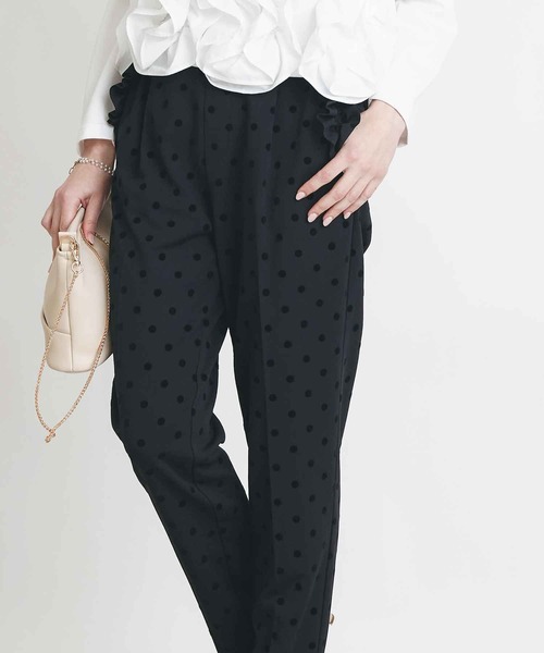 甘さときちんと感を両立したドットパンツ上品なフロッキードット柄のカットソー生地に、立体的なフリルを効かせた大人フェミニンな一本です。程よく伸びる生地で動きやすく、毎日つい手に取りたくなる履き心地。フロントタックとセンタープレスが脚のラインを綺麗に見せ、全体はすっきりとした印象に。ポケット部分のフリルがシンプルな中に女性らしいアクセントを添えます。ウエストは前はフラット、後ろはゴム仕様で、きちんと感と楽さを両立。後ろポケット付きなのも嬉しいポイントです。ほどよい甘さで、通勤にもお出かけにも活躍する、頼れるドットパンツです。※この製品はフロック加工(生地表面に細かく短い繊維を毛羽状に植えつける加工)が施されています。素材の特性上、着用や洗濯を繰り返すことにより毛羽が脱落します。バッグやベルトなどの適度な摩擦にご注意ください。※後ろウエストゴム仕様【詳細情報】厚み:□薄手 ■ふつう □厚手透け感: ■なし □あり光沢感: ■なし □あり伸縮性: □なし ■あり裏地: ■なし □ありポケット:□なし ■あり重量: Sサイズ約310g/Mサイズ約320g※撮影場所や明るさにより実際の商品と色味が若干異なる場合がございます。 ☆商品のお気に入り♡登録を押せば”再入荷通知”や”残りわずか通知” 値下げのお知らせが届きます!お気に入りのブランド登録していただければ新商品入荷のお知らせも届きますので是非登録してみて下さい。