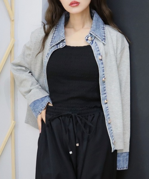 カーディガンとデニムのドッキングデザイン。コンパクトなシルエットと金釦できれいめ要素をプラス。デニムは襟部分と袖口だけの仕様なので着心地はやわらかく、らくちん◎トップスとしても、羽織りとしても着やすい万能カーディガン!ブラトップ合わせで抜け感をだしたり、ロゴTシャツを仕込んでカジュアルコーデにしたりと、オトナコーデに合わせやすい一着です。