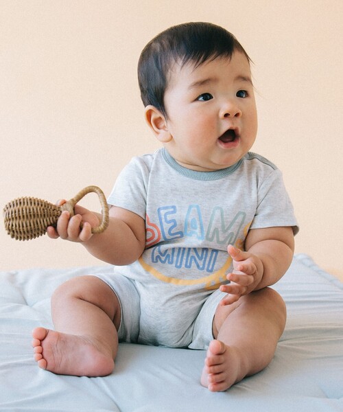 ベビーの笑顔はじける1着 スマイルロゴシリーズから、毎年人気のロンパースが登場! 絶妙なニュアンスカラーのボディに、フロントの大きなロゴがアクセント。プリントTシャツのような感覚で、ベスト合わせもサマになるアイテムです。 肩と股下はスナップボタン仕様で、動き回る赤ちゃんのお着替えやオムツ替えもスムーズ。 ご自宅用はもちろん、出産祝いとしても喜ばれること間違いなしです。毎日のお出かけがもっと楽しくなる、遊び心たっぷりの1着です。 ■ケア方法 水洗い可 (詳細は商品についている品質表示ラベルをご覧ください) 生地の厚さ:普通 伸縮性:あり 裏地:なし TOP GREY Model:H70(cm)Size:70 PINK Model:H61(cm)Size:70 LIGHT YELLOW Model:H63(cm)Size:70 MINT Model:H65(cm)Size:70 【対象年齢:およそ6~12ヵ月】 ※デリケートな赤ちゃんのお肌を守るために、着用前の水通しをおすすめいたします。 ※光の当たり具合やパソコンなどの閲覧環境によって実際の色味と異なって見える場合がございます。予めご了承ください。 ※商品の色味は商品単体で撮影した画像をご参照ください。 BEAMS mini / ビームス ミニ “BEAMSの安心感や信頼をこども服に” 創業から時代を越えて多くの方に共感いただける、オリジナルのこども服を展開。 元気なカラーリングやプレイフルなデザイン、ベーシックアイテムにファッション性を加えた着心地の良い一着をお届け。誰からも愛される、日常を彩るファッションを提案します。