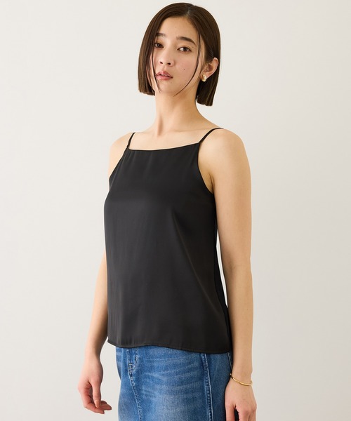 ジャケットインのスタイルにおすすめ!通年使える、見せて着られる大人キャミソール 【デザイン・シルエット】 ご好評いただいているキャミソール。 トレンドやシーズンを問わず着られる、シンプルでエレガントなデザインに仕上げました。 前見頃は光沢のあるサテンを二重にしているため、透けにくく、すっきりとしたネックラインを実現しています。 後ろ見頃はカットソー素材で、適度に身体にフィットするため、快適な着心地です。 【おすすめのスタイリング】 シアー素材のトップスやジャケット、ニットのインナーとしてはもちろん、レイヤードアイテムとしても活躍します。 着回しやすく、オン・オフ問わずコーディネートの幅が広がる一枚です。 【素材】 前見頃には光沢のあるサテン、後ろ見頃にはレーヨン混のドレープ性の高いカットソーを使用。 素材の組み合わせにより、美しいフォルムと快適な着心地を両立しています。 ---------------------------- 透け感:オフホワイト(15)はあり 裏地:なし 伸縮性:あり 光沢感:あり 生地の厚さ:薄手 ポケット:なし その他:かぶり/ストラップ部分調整可 洗濯:手洗い可能 ---------------------------- 【モデル情報】 モデル身長:171cm 着用サイズ:F ※画像の商品はサンプルです。実際の商品と仕様、加工、サイズが異なる場合がございます。 ※撮影場所やライティング、お使いのモニター環境によって色の見え方が異なる場合がございます。 ※商品のカラーは画像の色味をご参照ください。動画は仕様説明のため、色味が実物と異なる場合がございます。